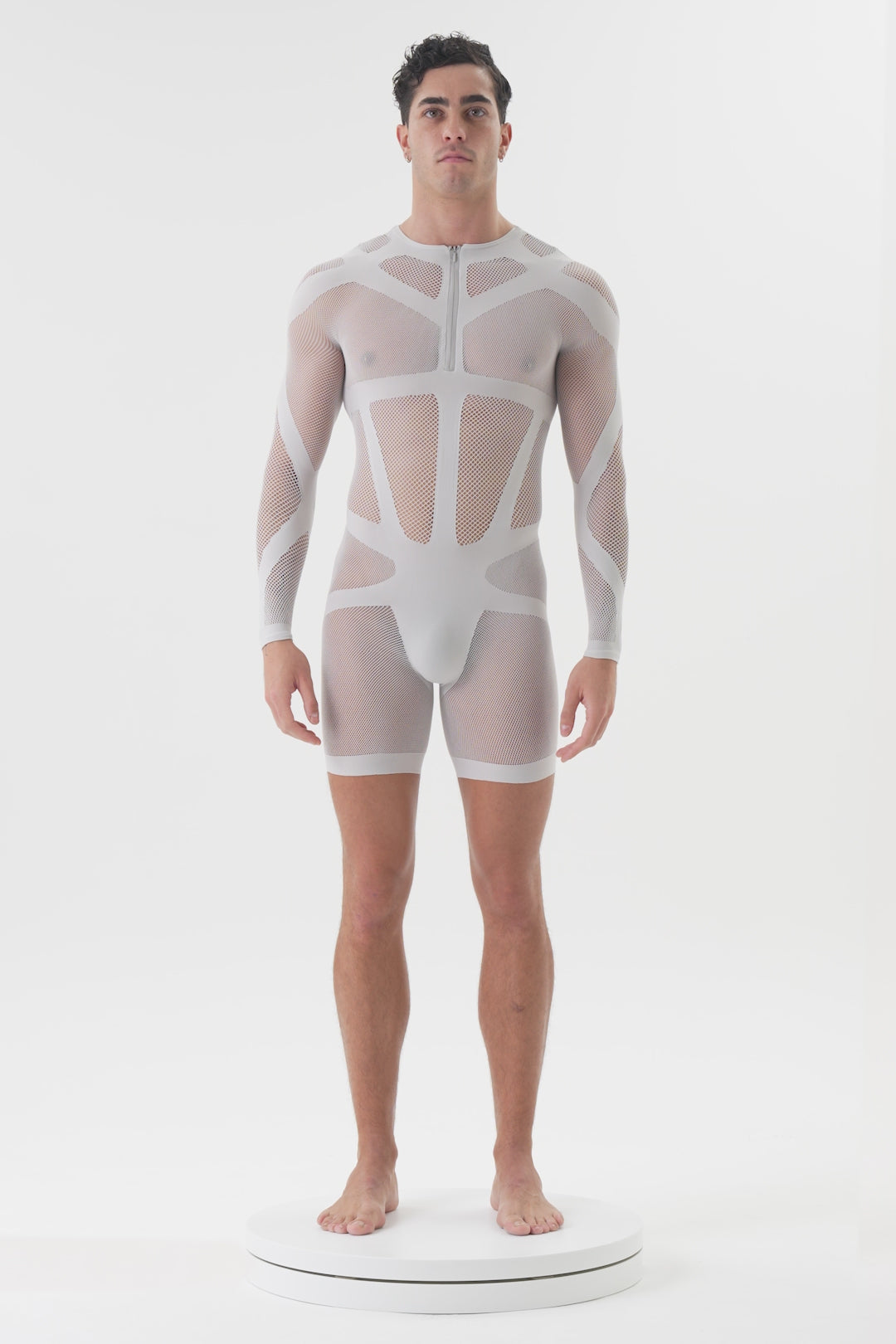 AN ATHLETIC CUT WITH BONDAGE-INSPIRED PANELLING; THIS LONG SLEEVE, SHORT BODYSUIT WITH CENTRAL ZIP DETAIL AND ROUND NECK IS MADE WITH SCULPT-FIT MESH TO FLATTER ALL BODY TYPES. BRANDED WITH A SILVER METALLIC DETAIL ON THE CENTRE BACK NECKLINE.